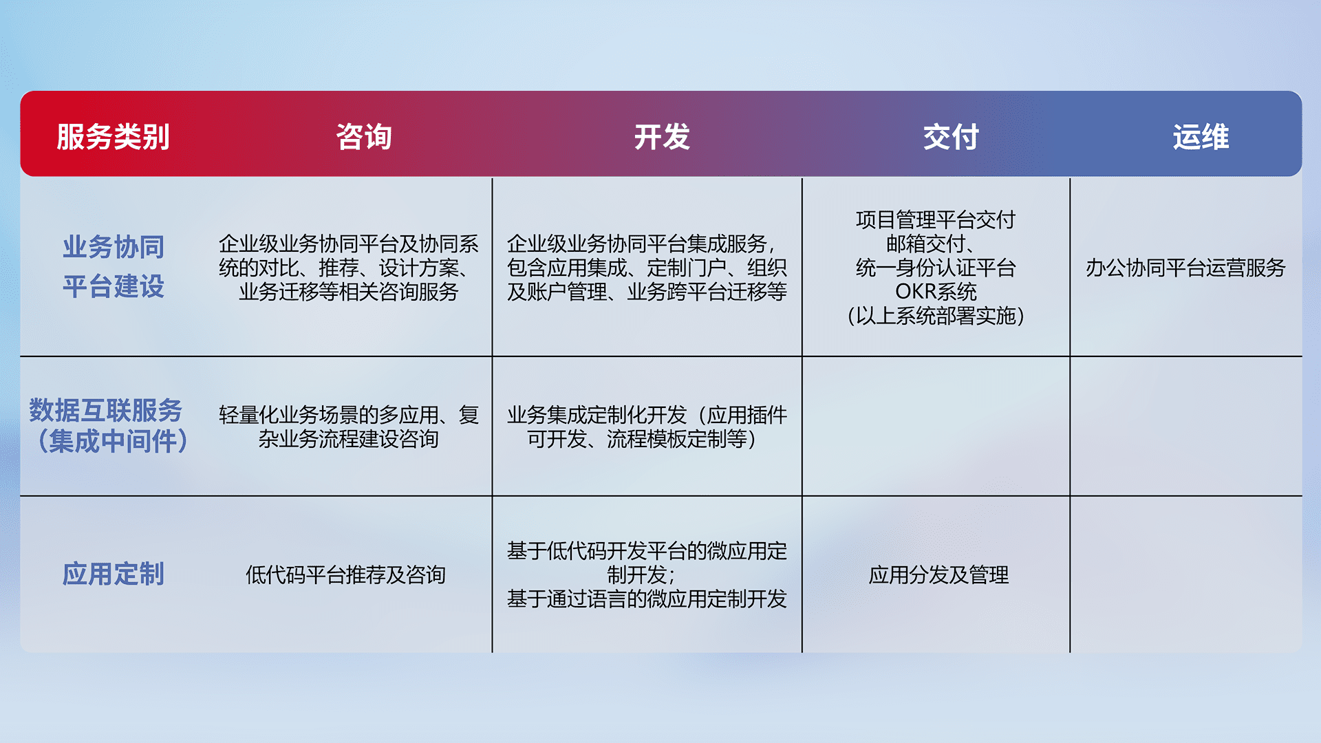针对钉钉、、企微、、IDaas等平台级产品提供产品的规划、、、、方案、、交付、、、定制化开发等服务,,,实现如统一协同办公、、智能客户服务、、混合会议管理、、智能数据查询、、、、等业务场景,,实现数字化转型。。。。