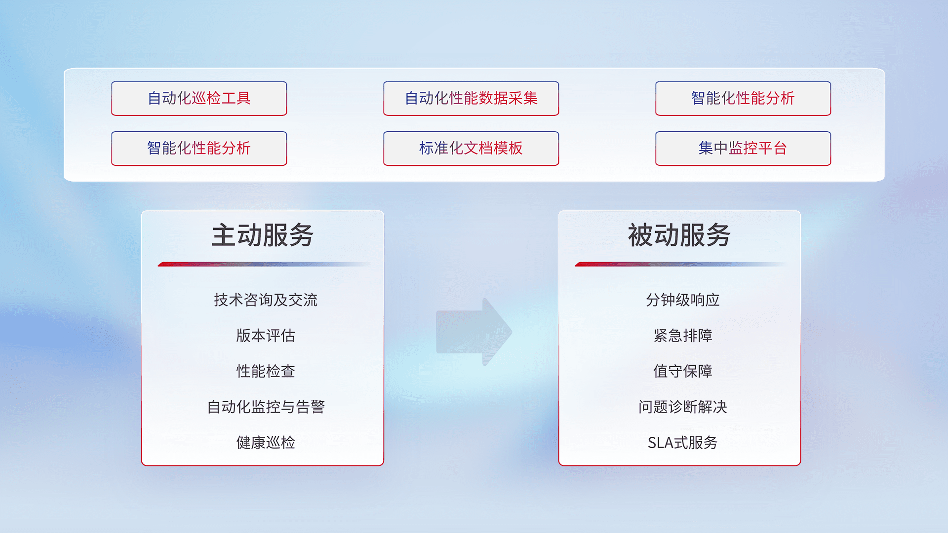 智能化工具和标准化文档,,保障服务质量,,提供主动服务(包含技术咨询、、版本评估、、、、性能检查、、自动化监控与告警、、、健康巡检)和被动服务包含(分钟级响应、、紧急排障、、、、值守保障、、、、问题诊断解决、、、、SLA服务)。。